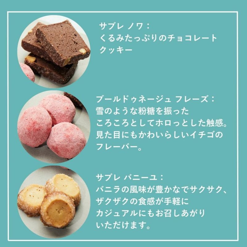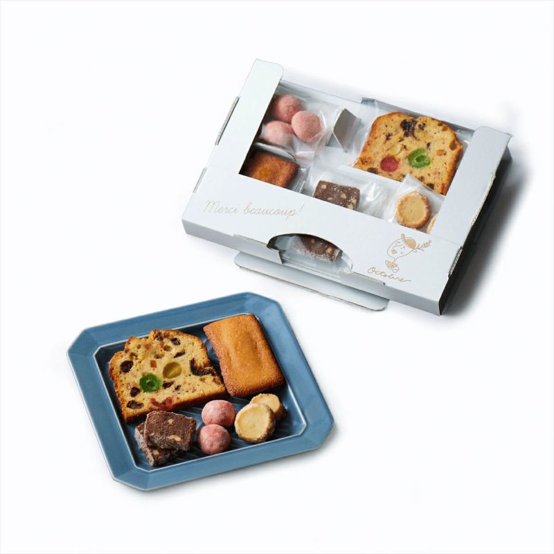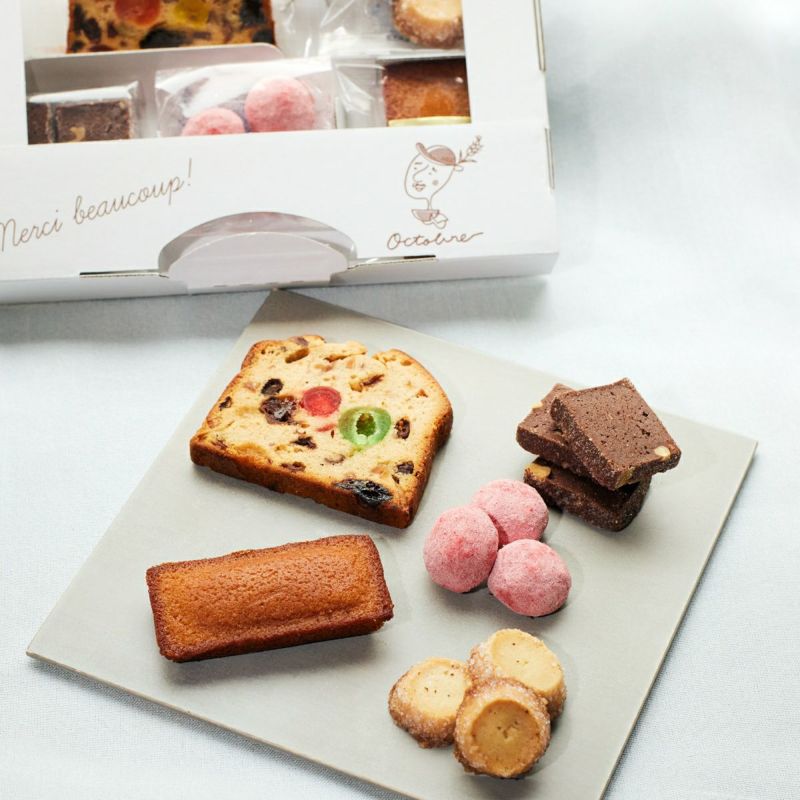 内容:ケイク クラシック フリュイ(ティータイムカット)1個、フィナンシェ ナチュール1個、サブレ ノワ3個、ブールドゥネージュ フレーズ3個、サブレ バニーユ3個入り